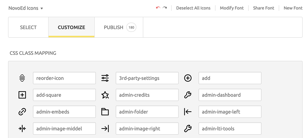 Customize your icon font by selecting the desired icons and checking the CSS mapping.
